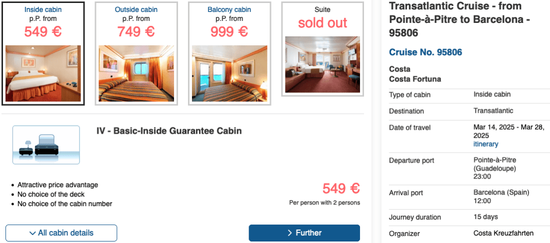In March 2025, the Costa Fortuna will leave the Caribbean and return to the Mediterranean for the upcoming summer season. You can join this cruise from Guadeloupe to Barcelona at an affordable price, with 14 nights in an interior cabin starting at just €549 per person. For an additional charge, ocean-view cabins are available from €749, and balcony cabins start at €999 (per person, based on double occupancy).