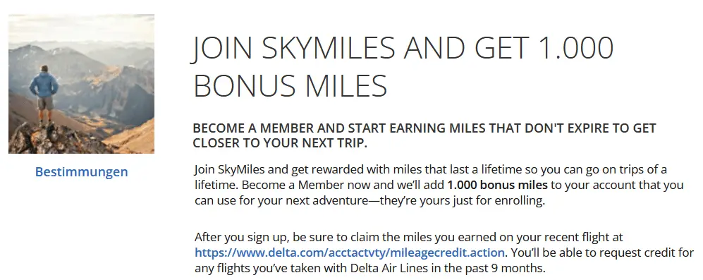 If you don’t already have an account with the SkyTeam frequent flyer program, Delta SkyMiles, now is a good time to create one. Because they are currently giving out 1,000 miles (worth around €10) for free for new members.