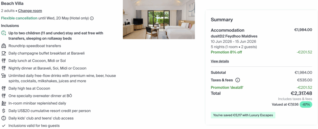 Thai luxury brand Dusit has recently opened a resort in the Maldives and is currently offering a good price through LuxuryEscapes. Between late April and September 2026, you can get a Beach Villa for only €464 per night, with all meals, drinks, and transfers included. The only conditions: You need to stay for at least 5 nights and use our promo code dealz8. The price is for two adults and up to two children.