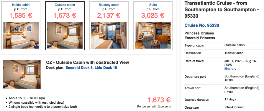 The Emerald Princess, operated by the American Princess Cruises cruise line, will embark on a cruise from Southampton to Iceland and Greenland in the summer of 2025. The price for 16 nights in an inside cabin currently starts at €1,585 per person. Other options include outside cabins for €1,673 and balcony cabins for €2,035 (per person, double occupancy).