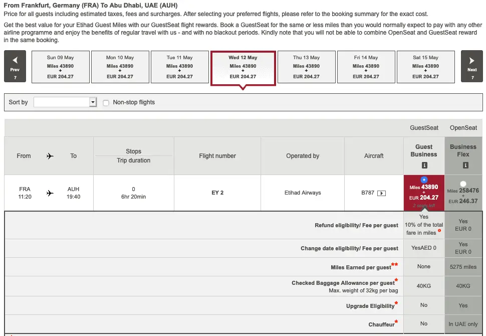 Etihad Airways‘ loyalty program Etihad Guest is currently running a very rare promotion. Until August 27, 2020, you can save 30% of your Etihad Guest miles when booking flights with them! The promotion covers flights until May 31, 2020. For example, a Oneway business class award ticket from Frankfurt to Abu Dhabi is available at 43,890 instead of 62,500 Miles. Only taxes & surcharges (in this case €204) are as high as usual.