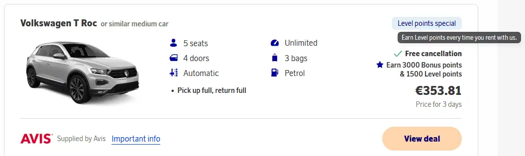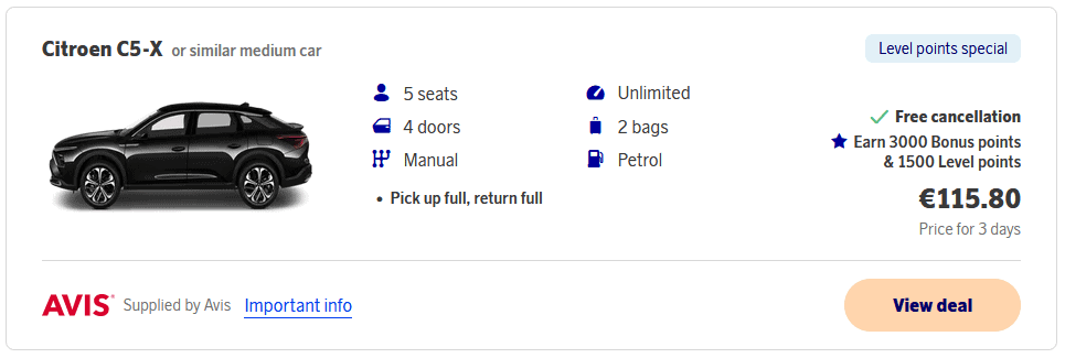 According to the promotion conditions, you would theoretically need to book at least Class C to earn the status points. That would be a VW Golf with GPS for €114. For peace of mind, you might want to choose a T-Roc or Citroen C5-X for €2 more, which explicitly states the level points: