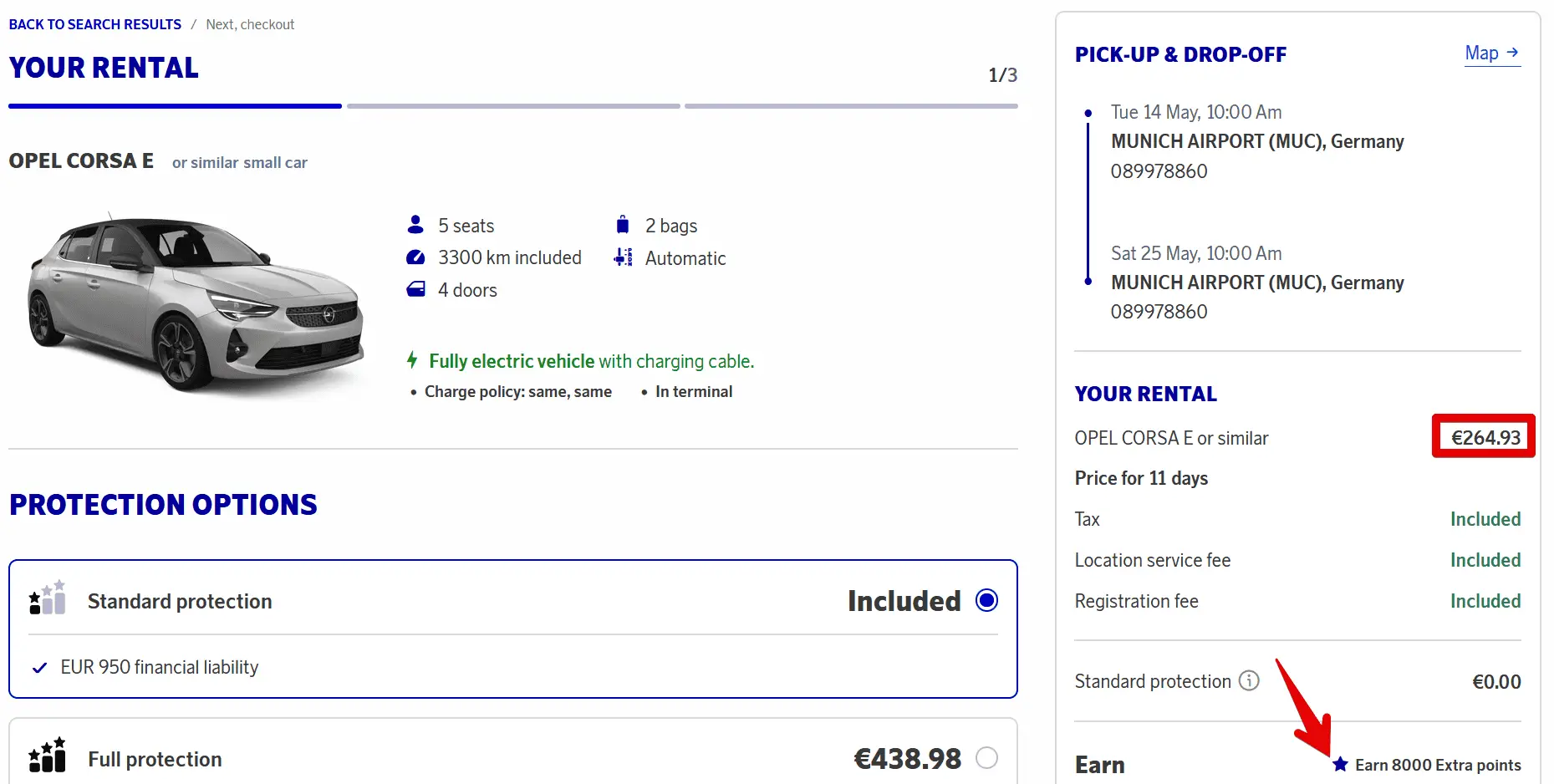 Through the SAS site, for instance, you can book an Opel Corsa E (or similar) for 11 days at Munich Airport for €265. During the booking process, 8,000 bonus points will be displayed, and on top of that, you should also receive 4,000 status points with EuroBonus.