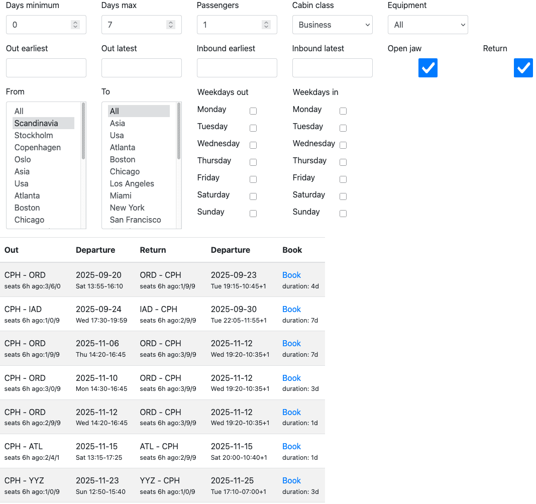 The best site to find availability for SAS EuroBonus award flights is awardhacks.se. We highly recommend that you use this tool as it can save you a lot of time, especially as the availability for business class flights is very low.