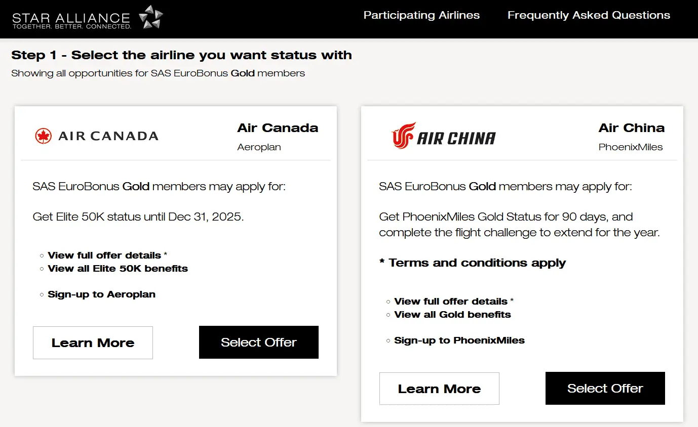 - SAS EuroBonus Gold/Diamond → Aeroplan Elite 50K (Star Alliance Gold)