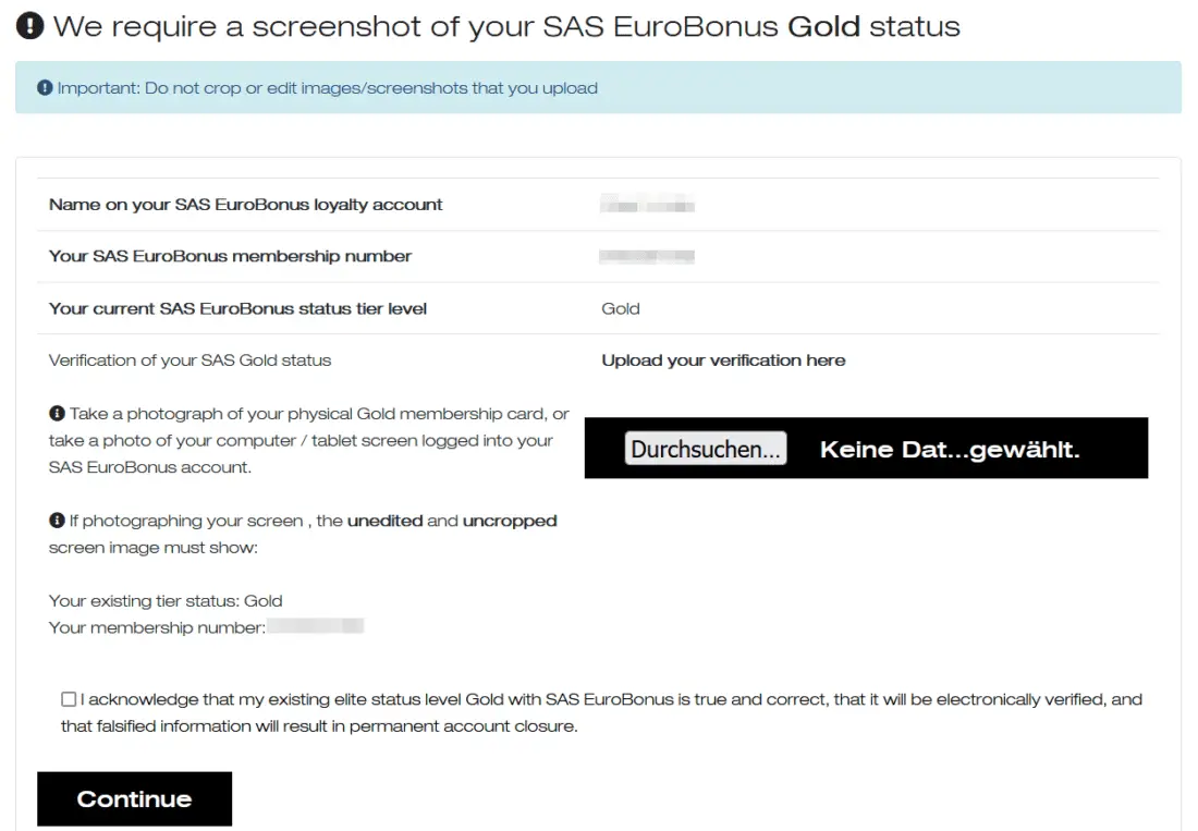 Then, you need to upload proof of your current EuroBonus status. That can be either a screenshot from your account or a photo of your plastic card: