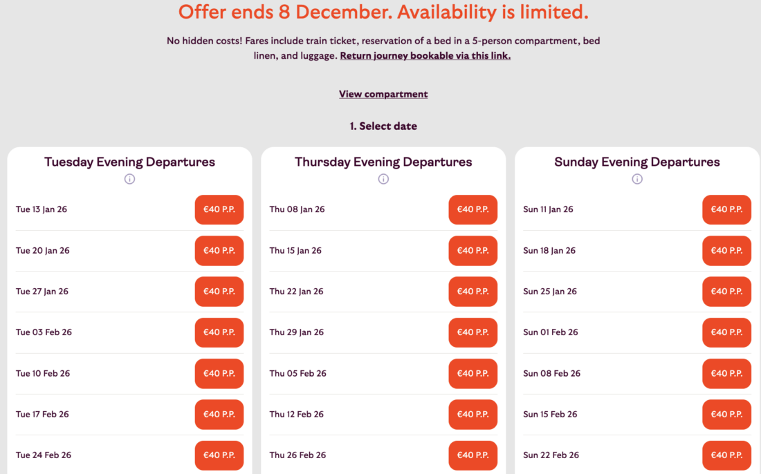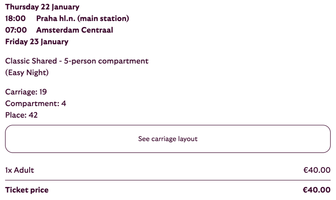 Currently, tickets in the couchette car are being offered at particularly low prices. A trip from Prague or Berlin to Brussels, Amsterdam, or Rotterdam, or vice versa, is available for €40 each way. These cheap tickets are available for travel betwee January 5 and March 31, 2026, booked by December 8, 2025.