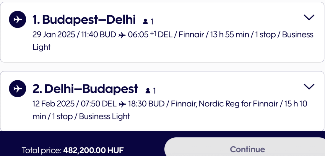 Oneworld member Finnair brings us today a business class deal from Budapest to Delhi, India starting at just HUF 482,200 (~€1,236). This deal is with Finnair’s Business Light fare which only includes hand luggage. For HUF 582,200 (~€1,492), you can book the Business Classic fare, where you will get 2x32kg checked luggage, lounge access, priority check-in & boarding, and priority security at the airport. Departures are available from April to February 2025.