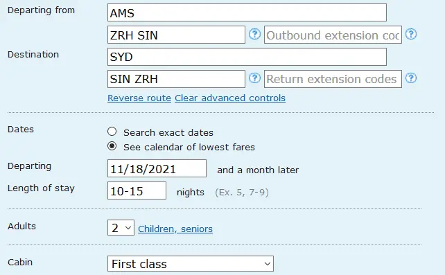 Enter the Amsterdam – Sydney connection, first class as your travel class, and at least two adults as passengers. If you skipped step one, you’ll have to guess the dates: