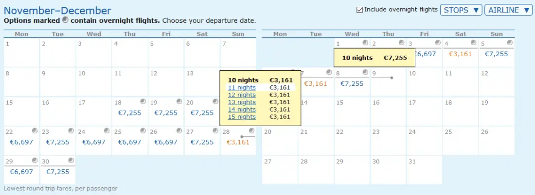 Once you click on a departure date, you can freely select the trip length. You’ll then be shown the flight details, which you will need for step 2.
