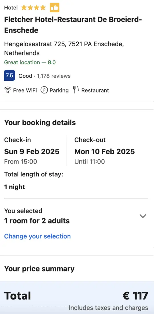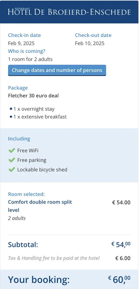 We’ve taken a look at the Fletcher Hotel-Restaurant De Broeierd-Enschede. From February 9 – 10, you can stay for €60. At online travel agencies, the same stay, a rate incl. breakfast would cost €117. So, you’d roughly be saving almost 50%. The savings will obviously vary depending on the hotel, so you should compare the prices for the hotel that you’re looking to stay at before booking.