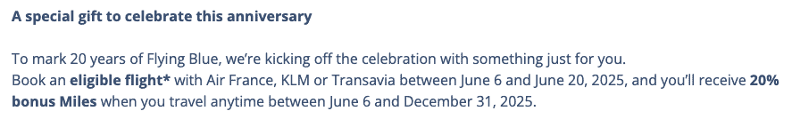 Flying Blue, the frequent flyer program of Air France and KLM, is celebrating its 20th anniversary. And so, their promotion features that exact number: You’ll get 20% more miles if you book an Air France, KLM, or Transavia flight between now and June 20. The flights then have to take place before December 31, 2025. The promotion is valid for all travel classes, except first class (or La Première, as those fancy French people call it).