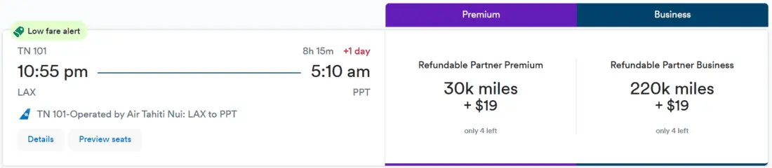 - Los Angeles → Papeete for 30,000 miles + US$19 (~€16) (nonstop)