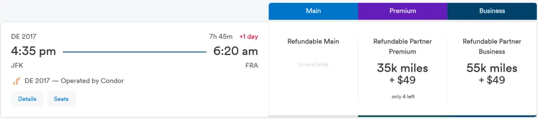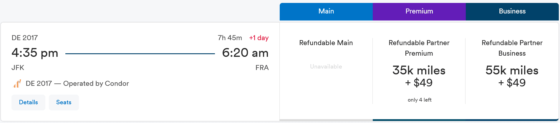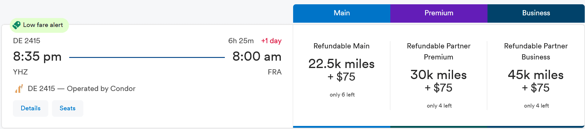 Condor is also a Mileage Plan partner. The Halifax – Frankfurt route falls within a short distance band and costs only 45,000 miles + US$75 (~€64) in business class: