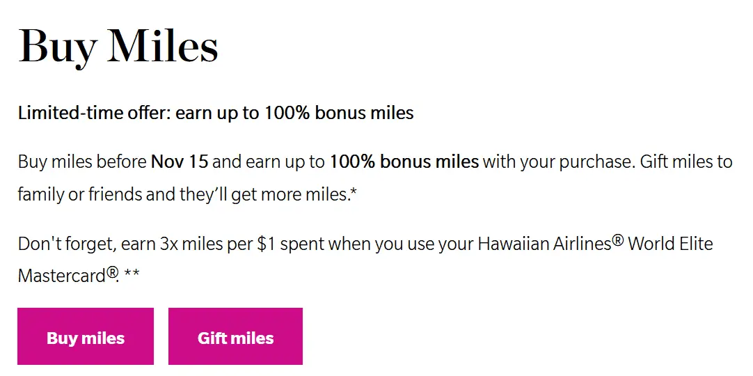 HawaiianMiles is currently advertising up to 100% bonus on Hawaiian mile purchases. Most accounts appear to receive the full 100%:
