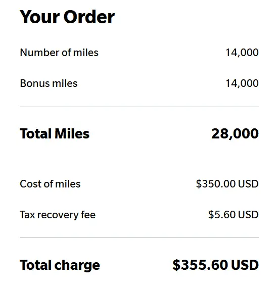 For instance, you could purchase 28,000 miles for US$355.60 (~€303.38), which translates to a price of 1.27 US cents or 1.17 euro cents per mile, including the tax recovery fee.