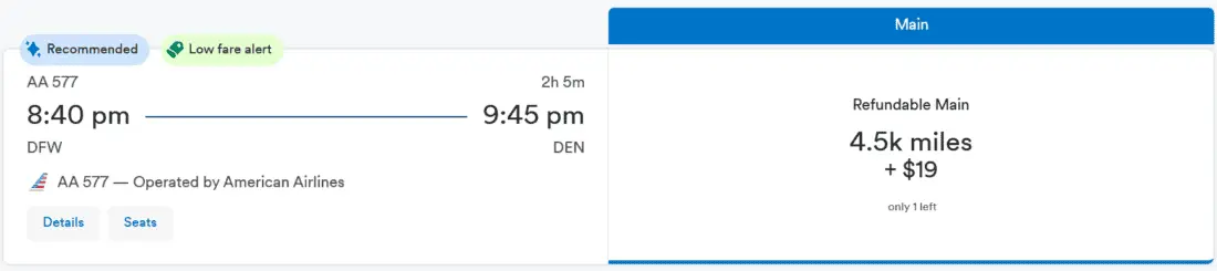 Award flights within North America start at 4,500 miles plus $19 in fees. Flights with Alaska Airlines are usually more expensive due to dynamic pricing, but flights with Oneworld partner American Airlines are very attractive: