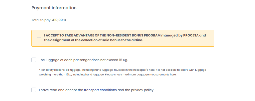 By the way, the amount of luggage including hand luggage must not exceed 15 kg. All luggage is stowed away during the flight. You should therefore leave larger pieces of luggage on the mainland if necessary.