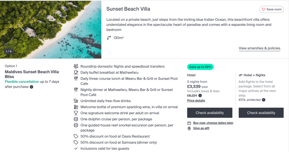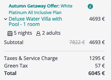On the resort’s website, the cheapest villa with an all-inclusive rate costs around €1,210 per night. While this is around 50% more expensive than what LuxuryEscapes is charging, the resort’s rate is refundable up to 14 days before arrival and for a water villa (which some guests may prefer). Still, it’s safe to say that you’re saving at least 20% by booking on LuxuryEscapes.