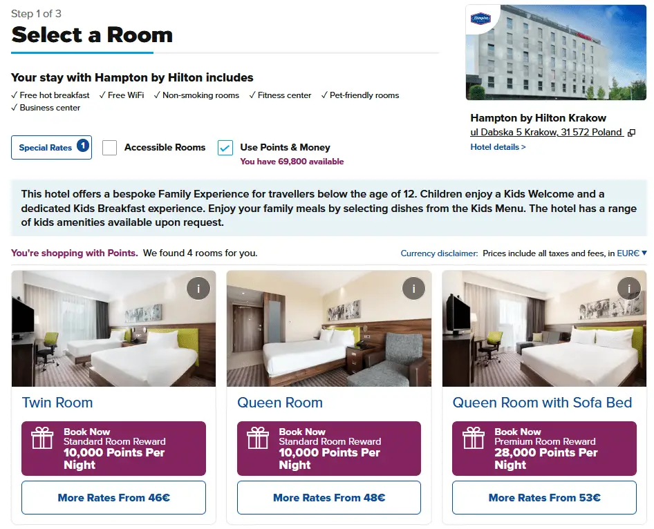 One of the cheapest hotels in Europe is the Hampton by Hilton in Kraków, Poland. Although it’s located outside the city centre, it usually only costs 10,000 points per night:
