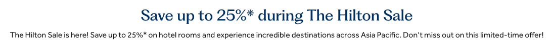 Hilton is currently running a sale with a discount of up to 25% (15% promotional discount + 10% Hilton Honors members discount) on hotels in Asia-Pacific for stays before December 31, 2025. The promotion runs until July 31, 2025.