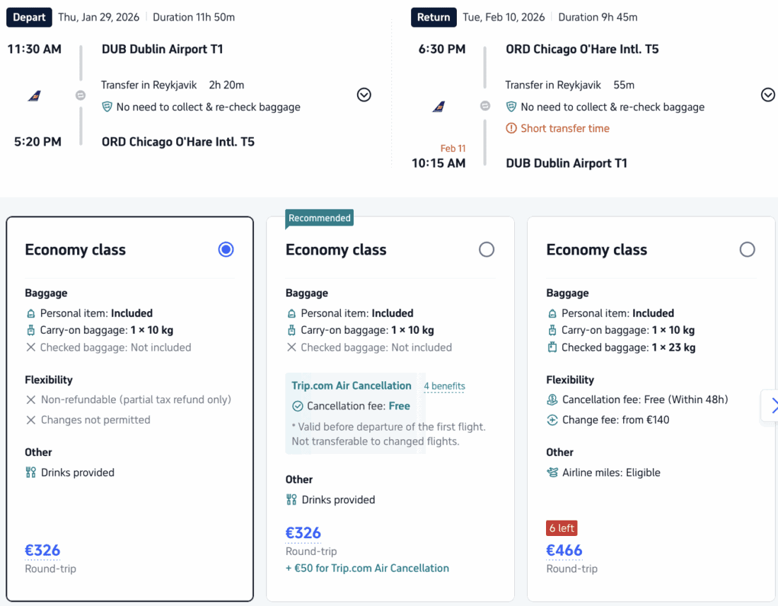 Our calendar displays all available dates and can redirect you to either Trip.com or Icelandair’s website. Both have similar prices, but Trip.com is usually ~€15 cheaper if you want to fly with luggage. Feel free to always check both options.