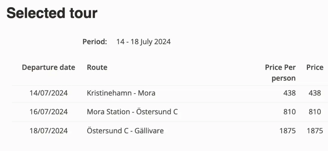 For these three sections, you would already pay a total of SEK 3,123 (~€282) on the mentioned dates. This is already SEK 578 (~€52) more expensive than buying the rail pass.