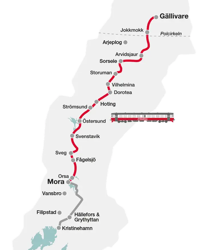 The route network covers approximately 1,300 km from Kristinehamn in the south to Gällivare in the north of Sweden.