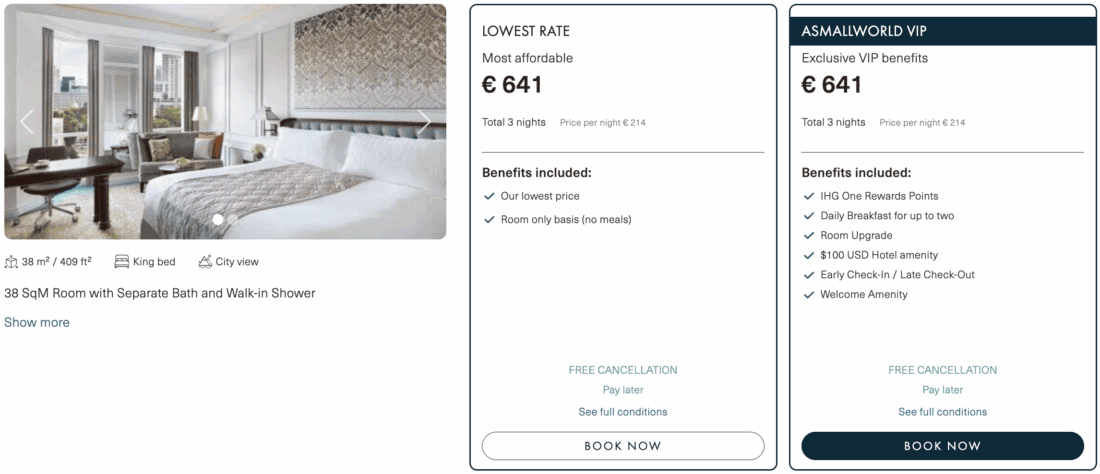 Browsing through ASMALLWORLD, we’ve notice that the price of the InterContinental Singapore drops significantly when staying for 3 nights. While there isn’t a 3-for-2 sale being advertised currently, something along those lines seems to be going on in the background. Prices start at €214 per night, including breakfast and US$100 (~€85) to spend at the hotel. Furthermore, this is a flex rate (cancellable up to 2 days before arrival), which is also eligible to earn IHG points and nights.