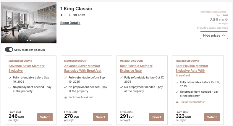 You’ll be staying in a Classic room, measuring 38 m2. The rate states that you’ll get an upgrade (based on availability), but that upgrade probably only means that you’ll be staying on a higher floor.