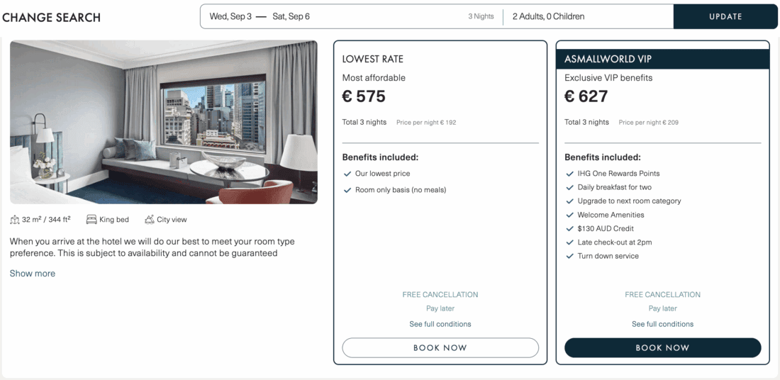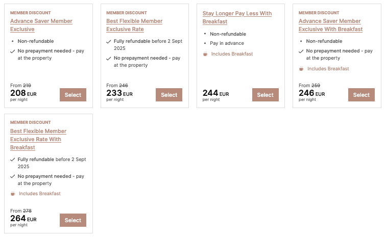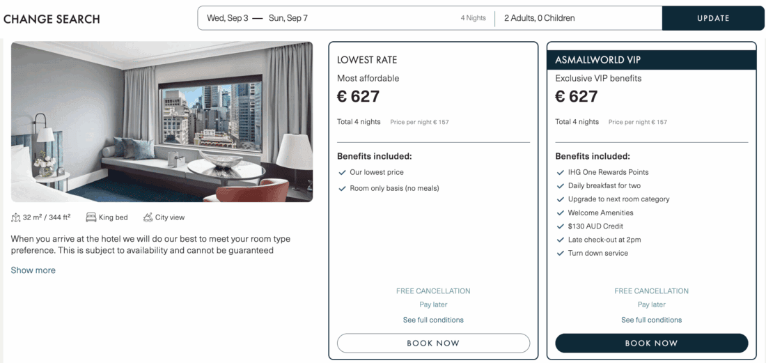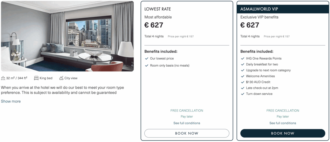 But let’s also compare the price to what IHG (the InterContinental Hotel Group) charges on its website: On the exact same four nights, the hotel is charging €264 per night for the refundable rate that includes breakfast! So, in reality, you’re saving even more than just the 25% of a 4-for-3 offer, but really over 40%, and that’s not even taking other extras, such as the A$130 (~€73) hotel credit into account.