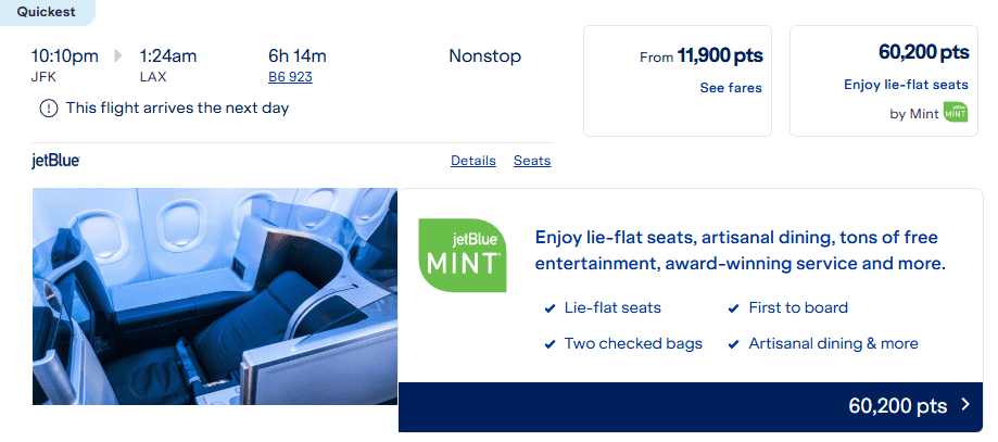 Flights in Mint business class on the same route start at 60,200 points per way, with the same low surcharges applying.
