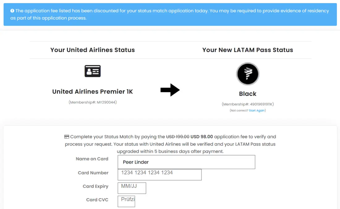 The status match is available only through the website latam.statusmatch.com. As previously mentioned, there is a fee of US$99 (~€84), which unfortunately is not immediately apparent.