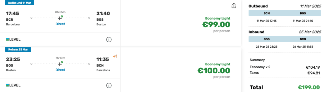 Tickets should be available until December 4, 2024 for departures between January and April 2025. You can find suitable dates using our calendar above or with the help of Google Flights. We recommend booking directly on Level’s website