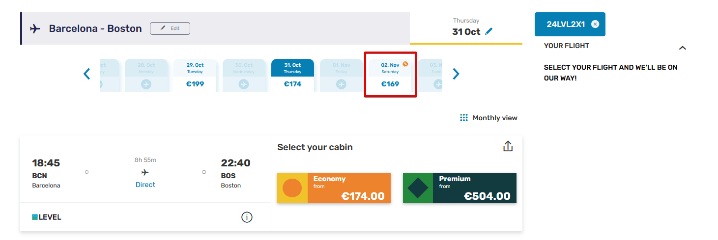 Sadly, these flights are rather complicated to find. We recommend using our availability calendar to go to LEVEL. Then, you need to enter the promo code 24LVL2X1 and check if your travel dates are eligible for the discount. Almost all November travel dates are, in contrast to other months. Then, you can buy your discounted round trips to Boston. The code only works for bookings of two persons.