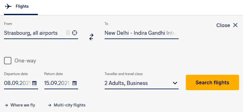 On the companion sale’ landing page, you’ll find a search form near the top. Simply select your route, preferred dates, and at least two passengers, e.g. like this: