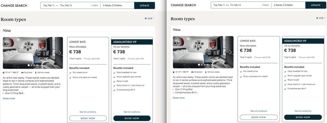 As you can see, ASW and the hotel’s website offer similar prices for one and two nights – though ASW offers additional benefits, such as the $100 credit, an upgrade, and more. For three nights, however, the price difference is astounding. While the price stays the same on ASW, the hotel charges its third night fully – which at such an expensive hotel results in a price difference of almost €800!