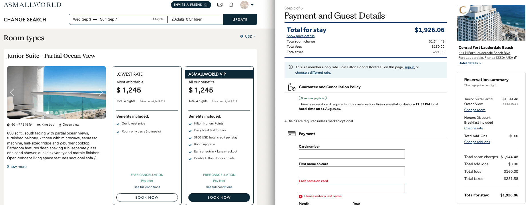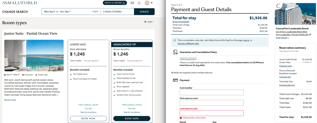 This example of the Conrad in Fort Lauderdale shows, that the hotel not only charges a higher price for 4 nights with breakfast (US$1,927 (~€1,644) instead of US$1,245 (~€1,062)), but ASMALLWORLD additionally grants you US$100 (~€85) property credit, an upgrade, and double Hilton Honors points.