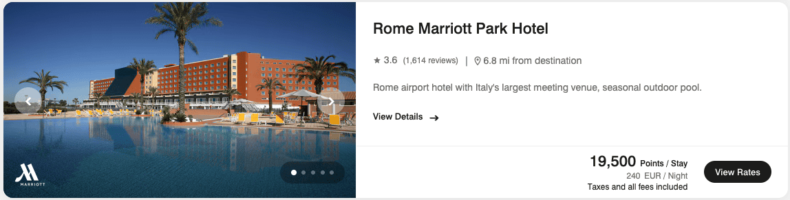 Those points can easily save you over $300 when you use them to book a hotel room in the future. E.g. at the Rome Marriott Park hotel, you’d get 2 nights with 39,000 points, and each night would usually cost €240.