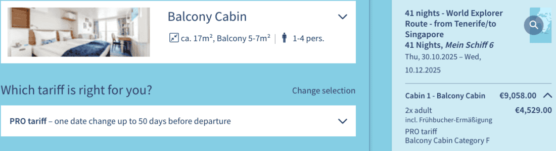 Currently, you can secure this cruise at attractive early booking prices. An interior cabin is available from €3,399 per person. If that’s not enough, you can book an outside cabin for €3,929 or a balcony cabin for €4,529 (per person for double occupancy).