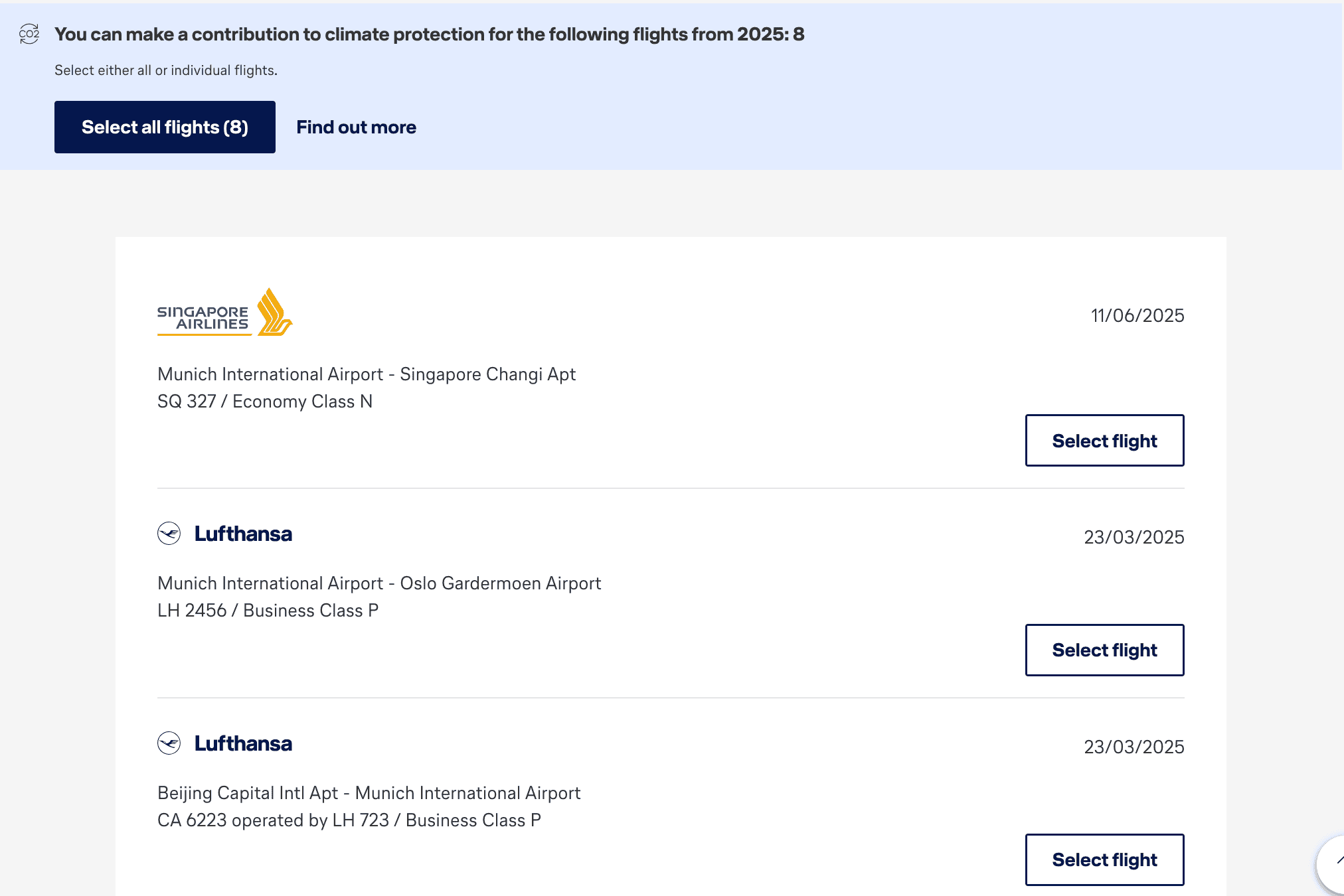 You can book compensation packages retroactively for flights you’ve already taken in 2025. If you’re booking a new flight on, for example, Lufthansa.com, you can also add the package during booking. The exact process differs slightly.