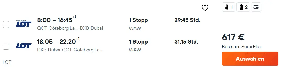 Let’s move on to an example that might be more practical. Although LOT unfortunately only flies with a Boeing 737 to Dubai, there are sometimes super-price tickets available. A roundtrip from Gothenburg costs just over €600. And with LOT, like with Lufthansa, you can earn both Qualifying and HON Circle Points.
