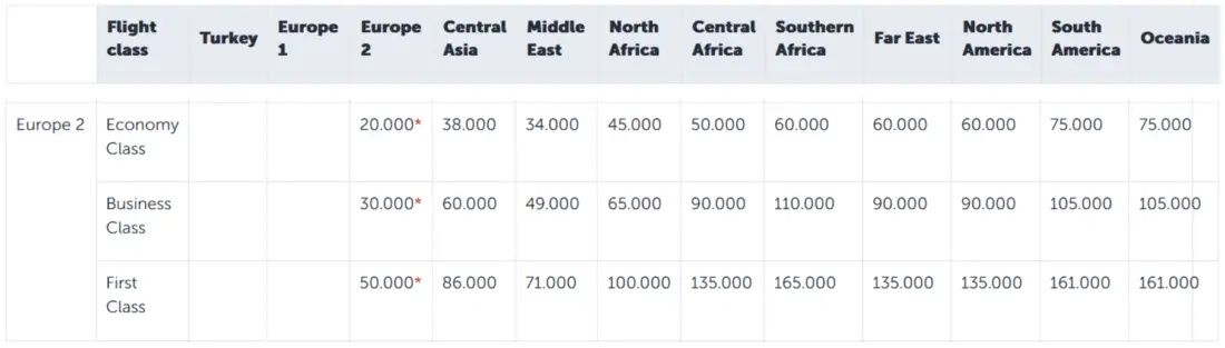 The following table shows the required number of miles for roundtrips to the many different regions (without the 30% discount):