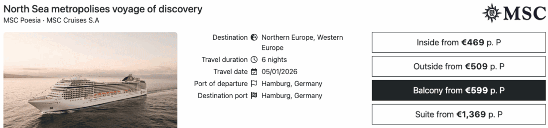 The MSC Poesia from MSC Cruises will be operating cruises from Hamburg in the upcoming winter season, visiting various major cities in Western Europe. You can currently book a 6-night trip starting at €469 per person. Oceanview cabins start at €509, and balcony cabins at €599 (prices per person based on double occupancy). For solo travellers, the cheapest inside cabin is available for €588, and even a balcony cabin only costs €757. That’s a surcharge of only around 25%.