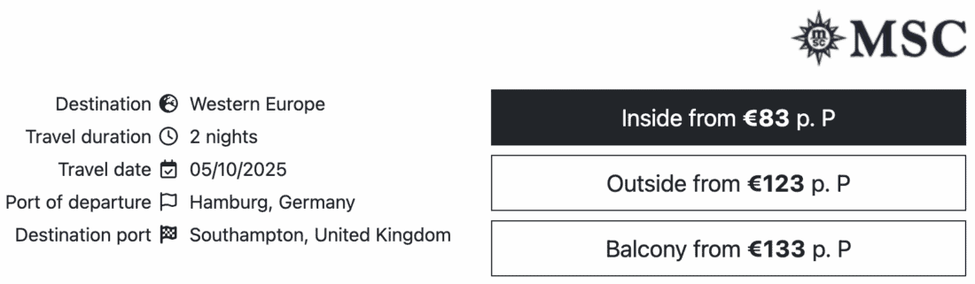 Not quite sure if a cruise is right for you? A short cruise is a great way to find out. In October 2025, you can travel from Hamburg to Southampton in 3 days aboard the MSC Preziosa for just €83 per person in a balcony cabin. All meals and tips are included.