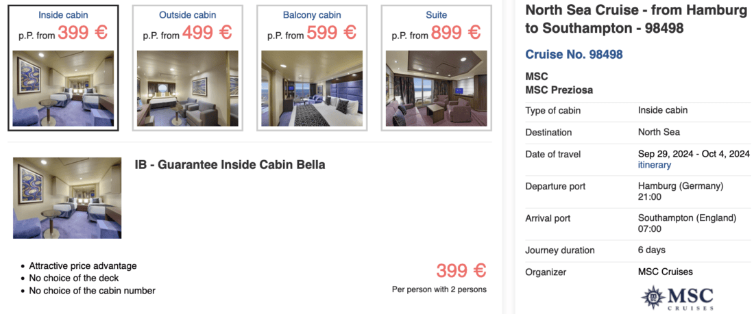 At the end of September 2024, you can travel from Hamburg to Southampton (around 130 km from London), spending 5 nights aboard the MSC Preziosa, paying just €399 per person for an inside cabin. All meals and gratuities are included. The outside cabin costs €99, and the balcony cabin is €599—each per person. Prices for solo travelers start at €738.