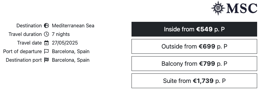 You can currently book MSC’s 7-night Mediterranean Dream Voyage for only €549 per person. The cruise begins and ends in Barcelona, and there are two available dates in May 2025. This is a very good price for spending a week on one of MSC’s newest and largest ships, including all meals and gratuities.