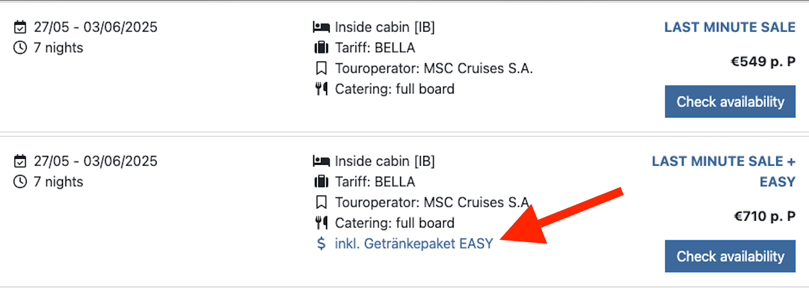 If you wish to book the offer with the drinks package, select the deal that states “inkl. Getränkepaket EASY”: