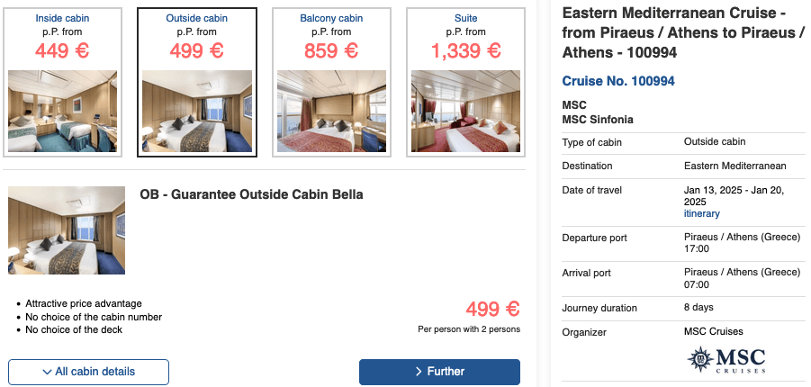 The MSC Sinfonia will embark on a few week-long cruises from Piraeus (~ 10km from Athens) in January 2025, and there is currently an interesting offer for these trips. Ocean-view cabins merely cost €499 per person. All meals and gratuities are included.