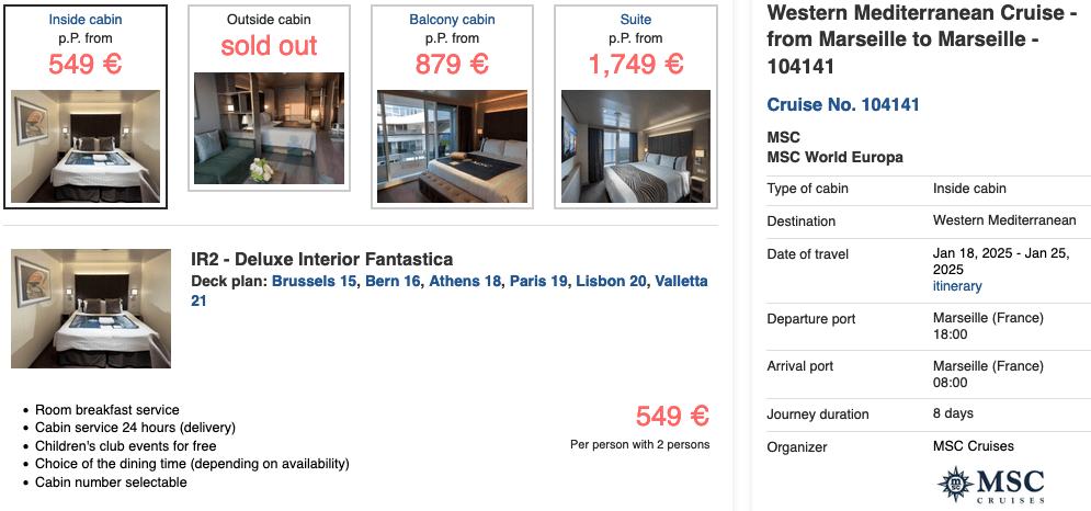In early 2025, you can board one of MSC’s newest ships, the MSC World Europa, and explore the Western Mediterranean for an entire week, paying only €549 per person, including tips and meals. The cruise starts and ends in Marseille.